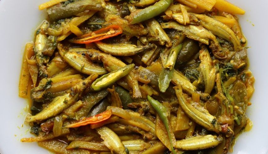 This recipe from Bangladesh contains a variety of foods and spices, illustrating one of the most important health behaviors—dietary diversity! Fish and other foods in the recipe—potatoes (tubers) and brinjal (eggplant in the berry family)—were important parts of our evolutionary diet. In addition to being tasty, this dish offers many nutritional benefits. Small fish, such as batashi, contain concentrated amounts of critical nutrients, including DHA, zinc, iodine, and vitamins A and B12, that promote brain development and growth. Olive oil enables absorption of some nutrients and is better for health than other more processed oils. Spices help with palatability and food safety and offer many micronutrients. This dish was selected for its nutritional qualities but also because batashi fish are environmentally sustainable and accessible to low-resource, undernourished communities in Bangladesh.