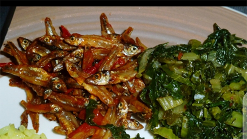 Our featured recipe this month is for Zambian kakeya or kapenta (sardines) cooked with tomatoes and onions and served with greens, cabbage, or nshima (cornmeal porridge). This small fish offers a terrific package of concentrated nutrients important for growth and brain development in children and general health for adults. Some other nutritional qualities include the following: