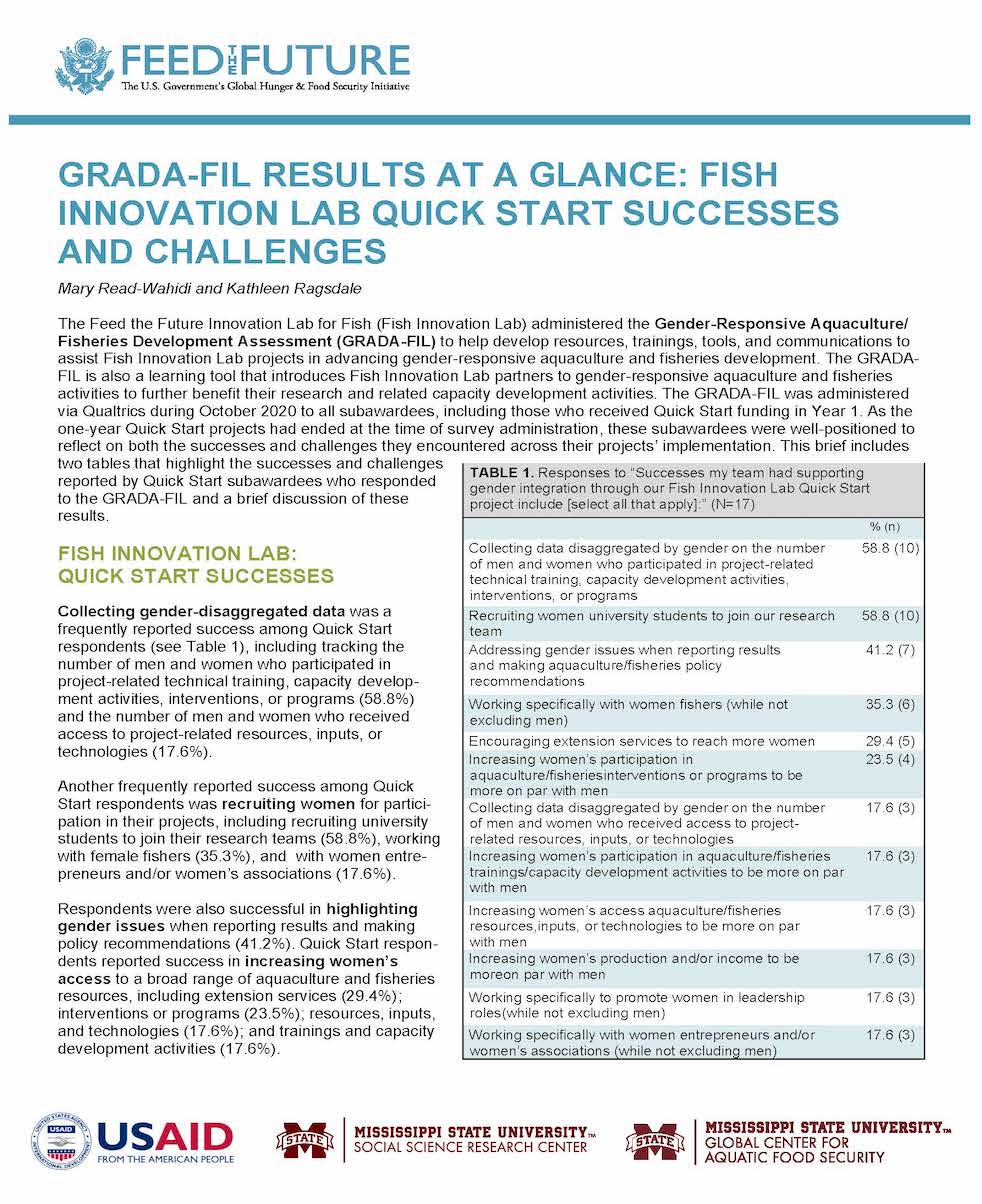 A new brief highlights successes and challenges shared by the quick start projects in their GRADA-FIL responses. Common themes include successes in collecting gender-disaggregated data, recruiting women to participate in projects, highlighting gender issues in reports and policy recommendations, and increasing women’s access to resources. However, quick start projects also reported challenges in these same areas. These results suggest that respondents from the quick start projects may be able to share first-hand experiences with other Fish Innovation Lab subawardees to help them navigate common challenges in implementing gender-responsive aquaculture and fisheries activities.