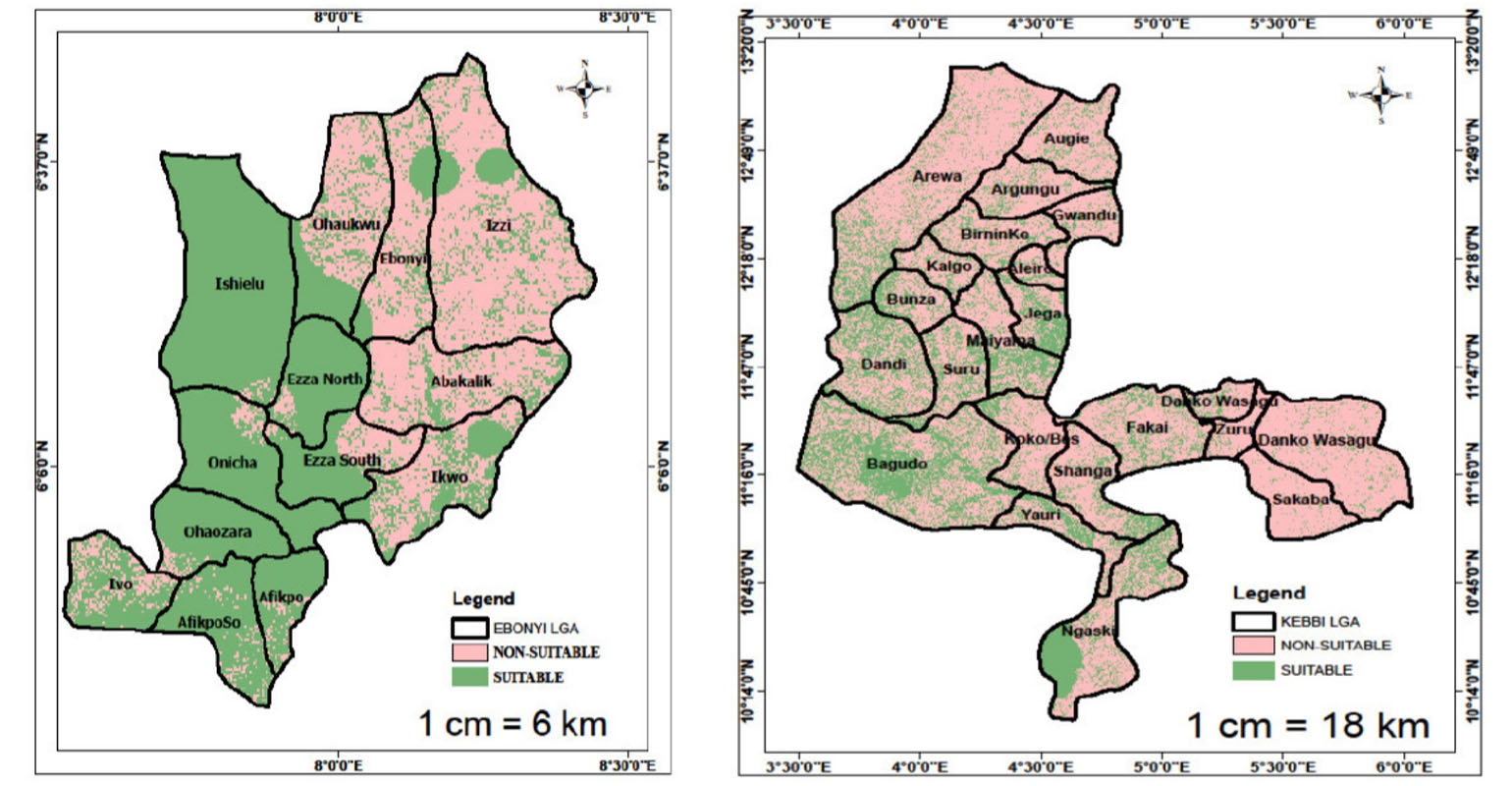 The ground-truth mission involved a full inventory of all wetland vegetation in each project site. Also, the team conducted preliminary evaluations of the identified wetland systems and recorded the full GPS readings of these locations. The GPS recordings and on-site physical verification of flora and geomorphological features of the locations during the ground-truth survey were used to compliment the desktop mapping process. This mapping process encompassed the overlaying of numerous GIS coverage layers—including aerial imagery, topographic data, and digital elevation models—to determine the suitability of wetland systems for integration of rice and fish. The efforts ultimately resulted in the production of wetland maps for Ebonyi and Kebbi states. The project team plans to publish a peer-reviewed journal article on the wetland maps. Meanwhile, two of the maps showing locations suitable for aquaculture production are shown in Figure 1.