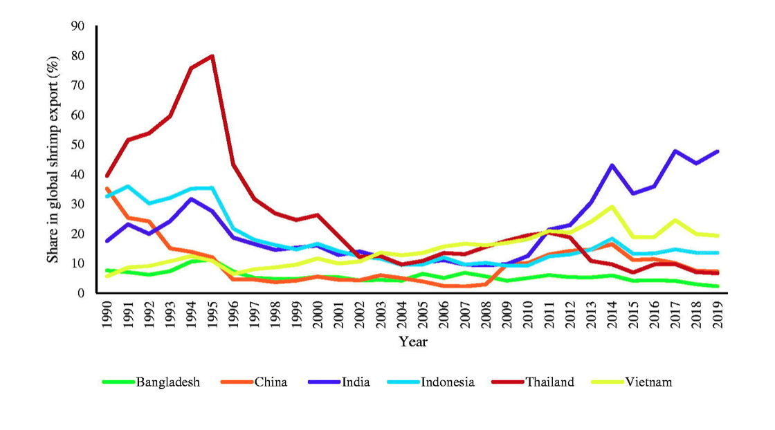 This study aims to explore the shrimp export competitiveness of Bangladesh, China, India, Indonesia, Thailand, and Vietnam time spanning from 1990 to 2019. However, emphasizing Bangladesh as a case country, this research looks into the factors influencing shrimp export competitiveness taking into account macroeconomic and policy variables. To do so, we used the recently developed Revealed Symmetric Comparative Advantage (RSCA) index to quantify export competitiveness, while a novel dynamic autoregressive distributed lag (ARDL) simulation approach to determine the factors driving shrimp export competitiveness. The findings show that all of the aforementioned countries seem to have some degree of shrimp export competitiveness during the study period, whereas Chain has entirely lost its export competitiveness after 2004. However, Bangladesh's shrimp export competitiveness has dipped marginally in recent years, despite continuous growth in competitor countries such as India, Indonesia, and Vietnam. Further, economic globalization, institutional quality, trade openness, number of trade agreements, and trade freedom all have a favorable impact on Bangladesh’s shrimp export competitiveness in the long-run, whereas the international or exporting price of shrimp has a detrimental influence in short-and long-run. Finally, these findings may have implications for a future shrimp export from Bangladesh and some policy recommendation are presented.