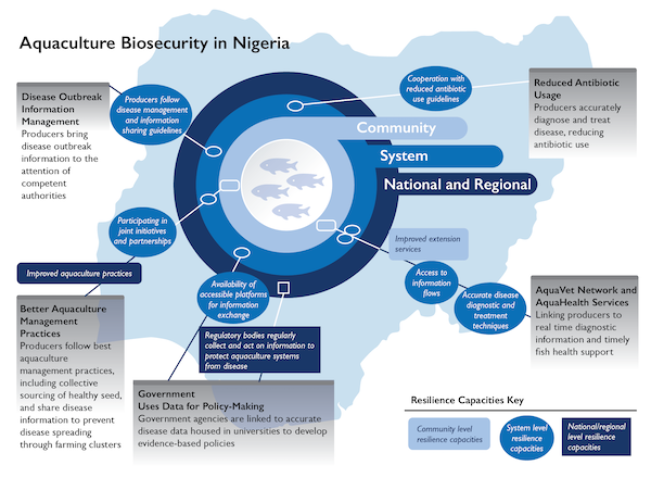 Often, producer and community resilience capacities depend on a more resilient fishery or aquaculture system as a whole. As an example, the Improving Biosecurity team in Nigeria deals with two related threats to the aquaculture system—the potential shock of disease outbreaks and the stress of increasing antimicrobial resistance. These challenges are often underreported and difficult to manage in low-resource settings. The team takes an integrated or “One Health” approach to tackling these challenges that address the health of animals, people (in this case, the consumers), and the environment.
