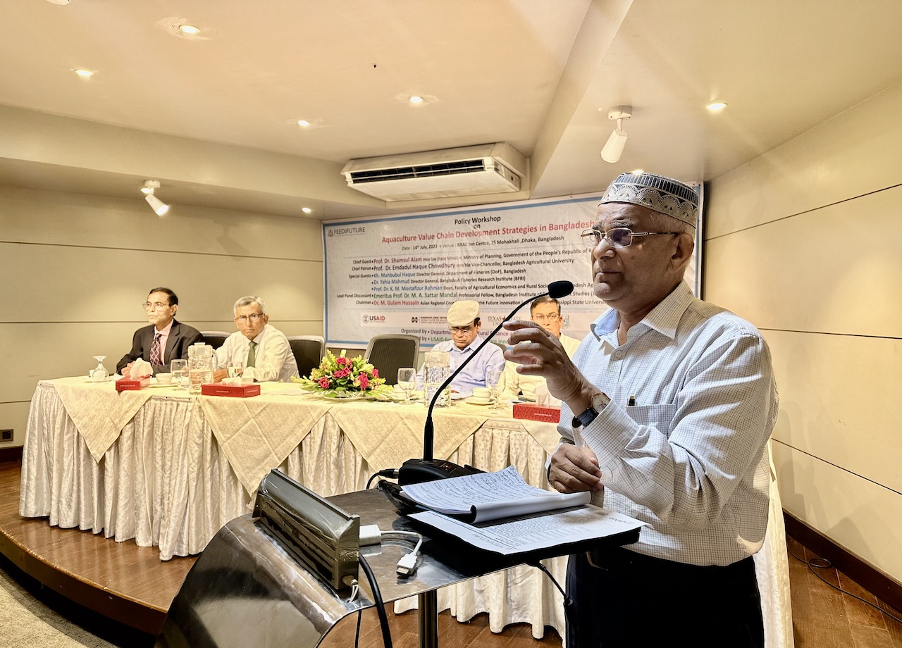 During his address, Chief Guest Shamsul Alam praised the activity for generating information that will be useful for aquaculture policy. The director general of DoF also expects to share some of the generated aquaculture strategies in the forthcoming fisheries policy document being formulated by DoF soon. Emdadul Haque Chowdhury, the vice-chancellor of BAU, expressed his gratitude to the Fish Innovation Lab for their funding and all other support to this activity as well as two other ongoing activities at BAU. He thanked Madan Dey, Akhtaruzzaman Khan, and the research team for conducting and developing such promising aquaculture value chain strategies, which will indeed play a vital role in formulating related national policies in Bangladesh.